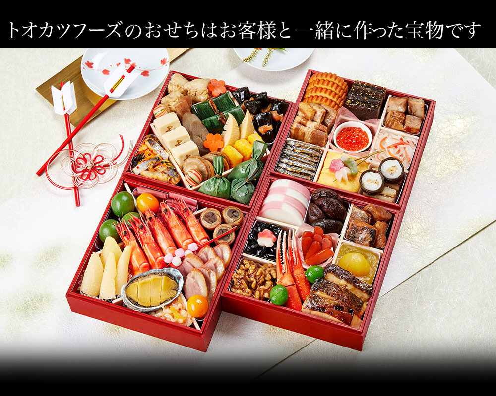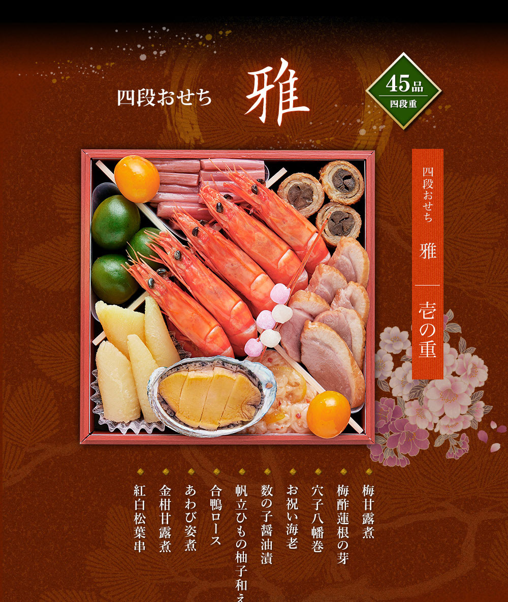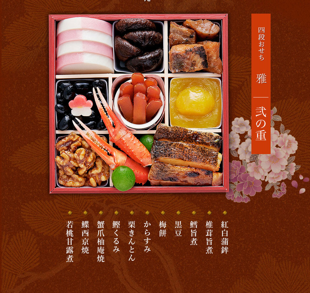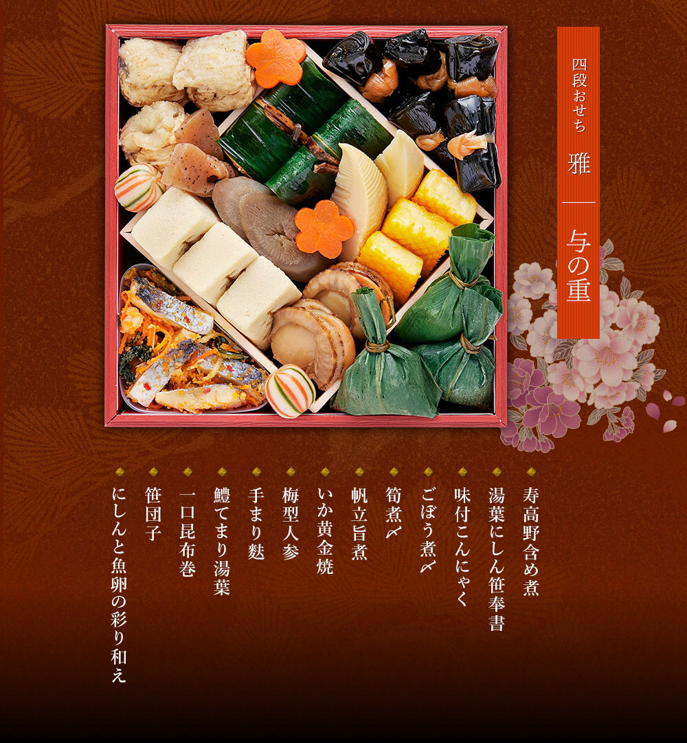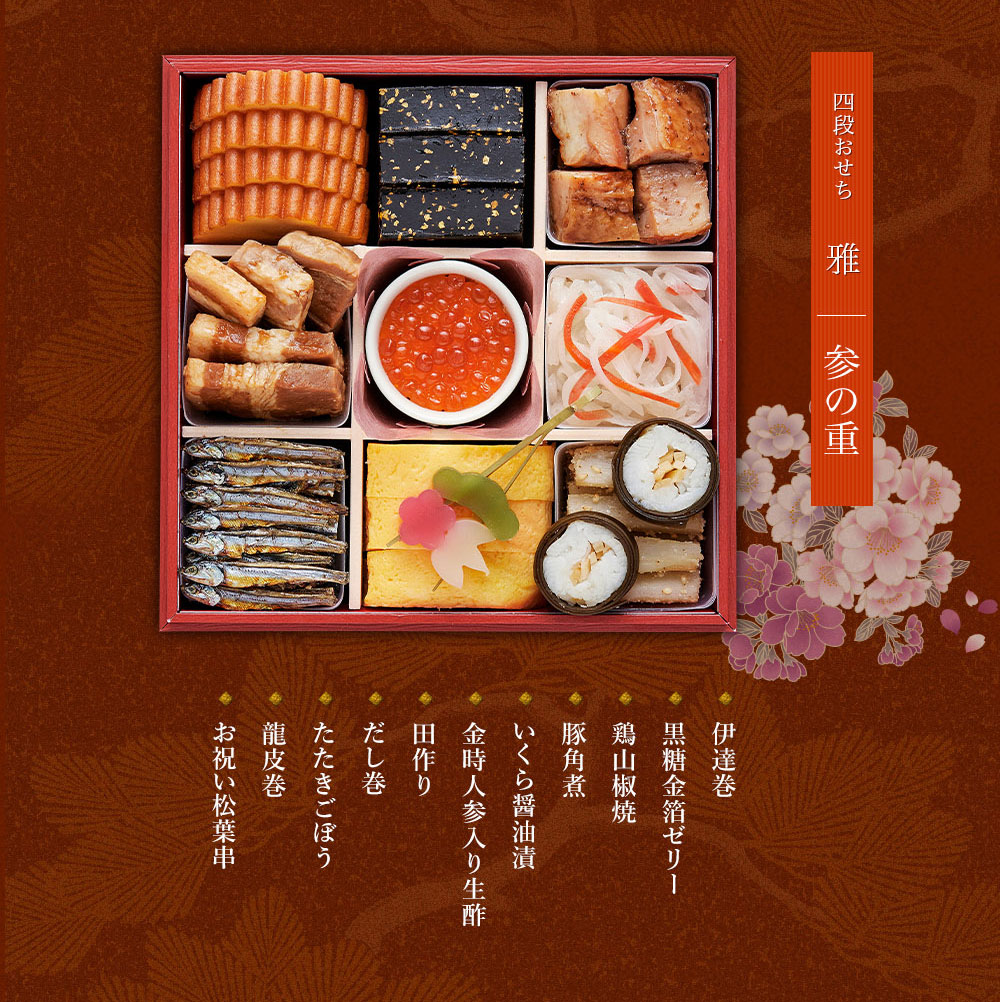 | メニュー(全45品目) | 【一の重】 梅甘露煮/ 一口昆布巻/ 穴子八幡巻/ お祝い海老/ 数の子醤油漬/ 梅酢蓮根の芽/ 合鴨ロース/ あわび姿煮/ 金柑甘露煮/ 紅白松葉串 【二の重】 紅白蒲鉾/ 椎茸旨煮/ 鱈旨煮/ 豚角煮/ いくら醤油漬/ 栗きんとん/ 黒豆/ 梅餅/ いか黄金焼/ 鰈西京焼/ 若桃甘露煮 【三の重】 鶏山椒焼/ 黒糖金箔ゼリー/ 伊達巻/ だし巻/ からすみ/ 田作り/ 鰹くるみ/ 金時人参入り生酢/ たたきごぼう/ 龍皮巻/ お祝い松葉串 【四の重】 寿高野含め煮/ 湯葉にしん笹奉書/ 味付こんにゃく/ ごぼう煮〆/ 蟹爪柚庵焼/ 筍煮〆/ 帆立旨煮/ 梅型人参/ 手まり麩/ 鱧てまり湯葉/ 帆立ひもの柚子和え/ にしんと魚卵の彩り和え/ 笹団子 |
