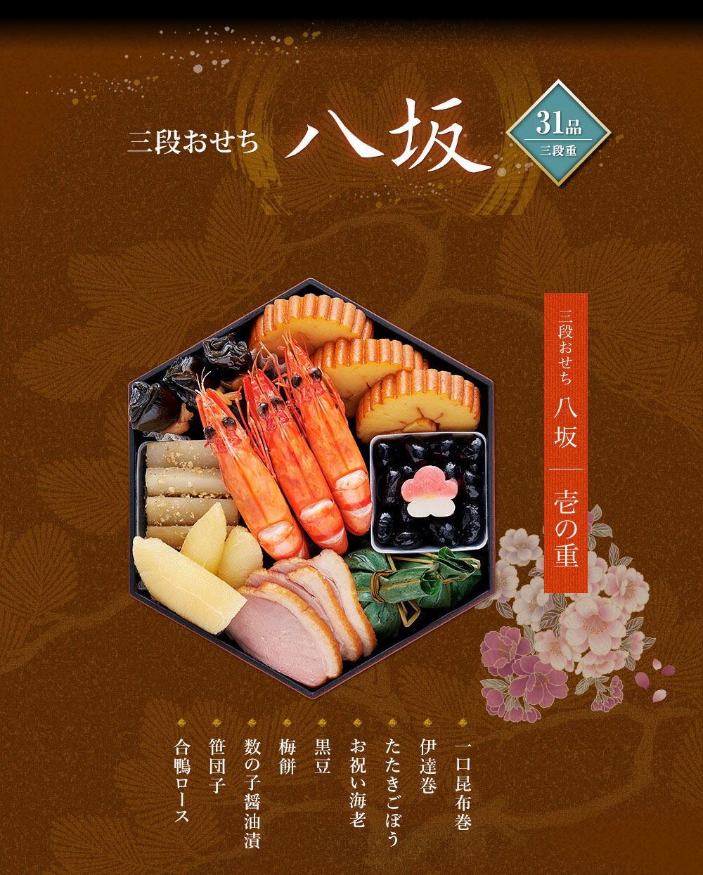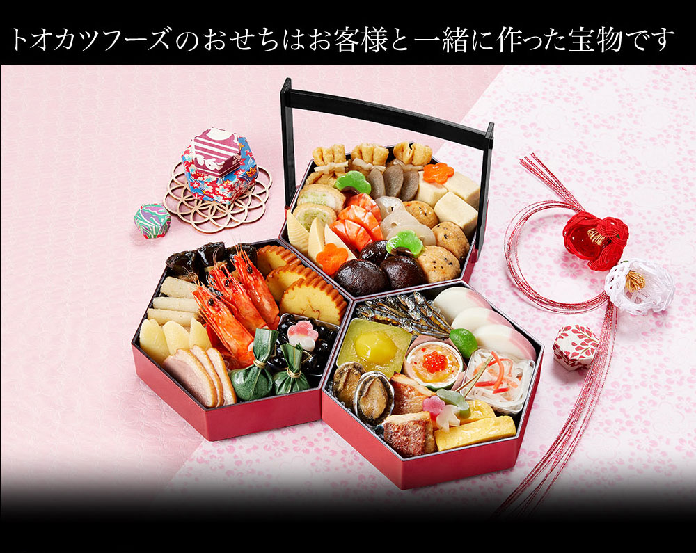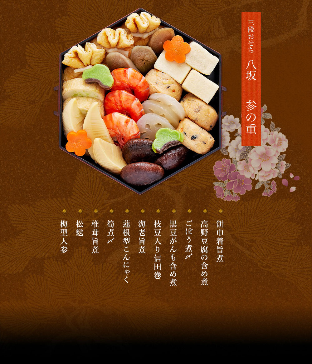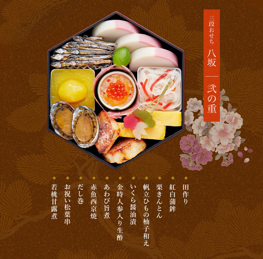 | メニュー(全31品目) | 【一の重】 一口昆布巻/ 伊達巻/ たたきごぼう/ お祝い海老/ 黒豆/ 梅餅/ 数の子醤油漬/ 合鴨ロース/ 笹団子 【二の重】 一口昆布巻/ 紅白蒲鉾/ 金時人参入り生酢/ 帆立ひもの柚子和え/ いくら醤油漬/ 栗きんとん/ だし巻/ 赤魚西京焼/ あわび旨煮/ お祝い松葉串/ 若桃甘露煮 【三の重】 高野豆腐の含め煮/ 餅巾着旨煮/ 黒豆がんも含め煮/ 椎茸旨煮/ 海老旨煮/ 蓮根型こんにゃく/ 筍煮〆/ ごぼう煮〆/ 枝豆入り信田巻/ 松麩/ 梅型人参 |
