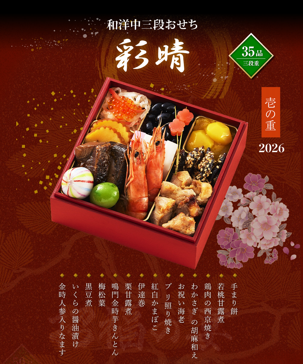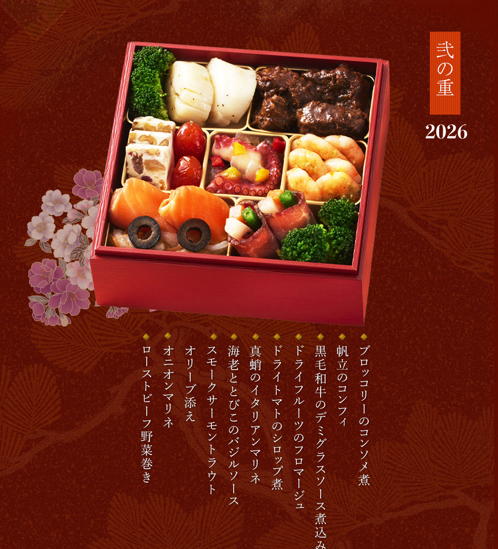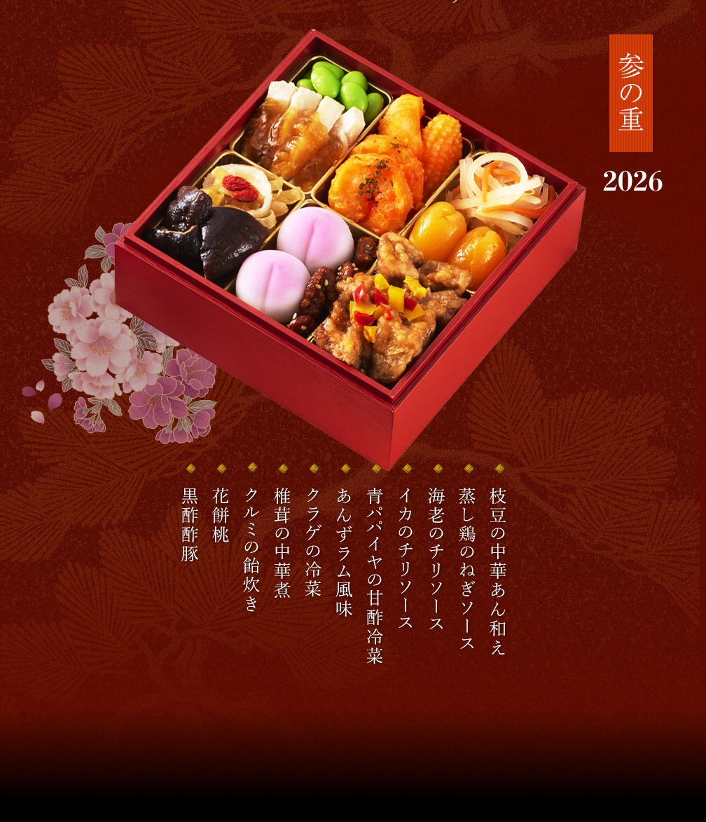 【一の重-和風-】 手まり餅/若桃甘露煮/鶏肉の西京焼き/わかさぎ の胡麻和え/お祝い海老/ブ リ照り焼き/紅白かまぼこ/伊達巻/栗甘露煮/鳴門金時芋きんとん/梅松葉/黒豆煮/いくらの醤油漬け/金時人参入りなます 【二の重-洋風- 】 ブロッコリーのコンソメ煮/帆立のコンフィ/黒毛和牛のデミグラスソース煮込み/ドライフルーツのフロマージュ/ドライトマトのシロップ煮/真蛸のイタリアンマリネ/海老ととびこのバジルソース/スモークサーモントラウト /オリーブ添え/オニオンマリネ/ローストビーフ野菜巻き 【三の重-中華-】 枝豆の中華あん和え/蒸し鶏のねぎソース/海老のチリソース/イカのチリソース/青パパイヤの甘酢冷菜/あんずラム風味/クラゲの冷菜/椎茸の中華煮/クルミの飴炊き/花餅桃/黒酢酢豚 |